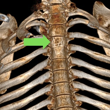 El tumor vertebral dorsal puede ocasionar compresión de la médula espinal, dolor intenso y alteraciones neurológicas progresivas. En algunos casos, estos tumores presentan componente hemorrágico que incrementa la presión sobre las estructuras nerviosas. El tratamiento quirúrgico puede incluir descompresión medular para liberar la médula espinal, toma de biopsia para establecer el diagnóstico histopatológico y artrodesis dorsal con instrumentación para estabilizar la columna vertebral. Este abordaje permite reducir el riesgo de daño neurológico, aliviar los síntomas y mantener la estabilidad vertebral. La cirugía se realiza con técnicas especializadas que buscan preservar la función neurológica y mejorar la calidad de vida del paciente.